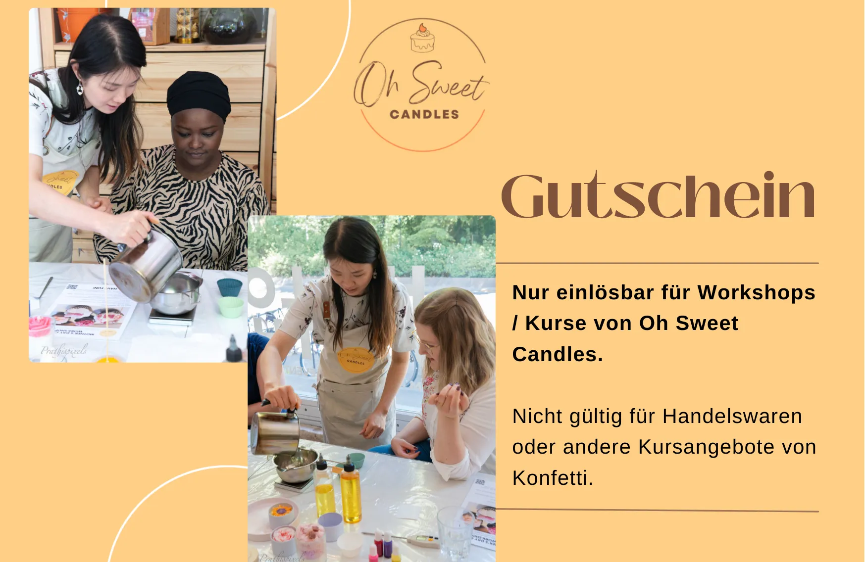 Dein Gutschein ist exklusiv für Oh Sweet Candles Workshops einlösbar. Er gilt nicht für andere Kurse auf Konfetti / Kerzen.